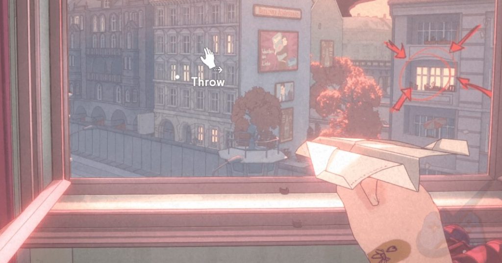 Now go back to the window and be ready to throw the paper plane, you need to hit the balcony (red circled) first try to be able to unlock this, otherwise you have to start a new game save.