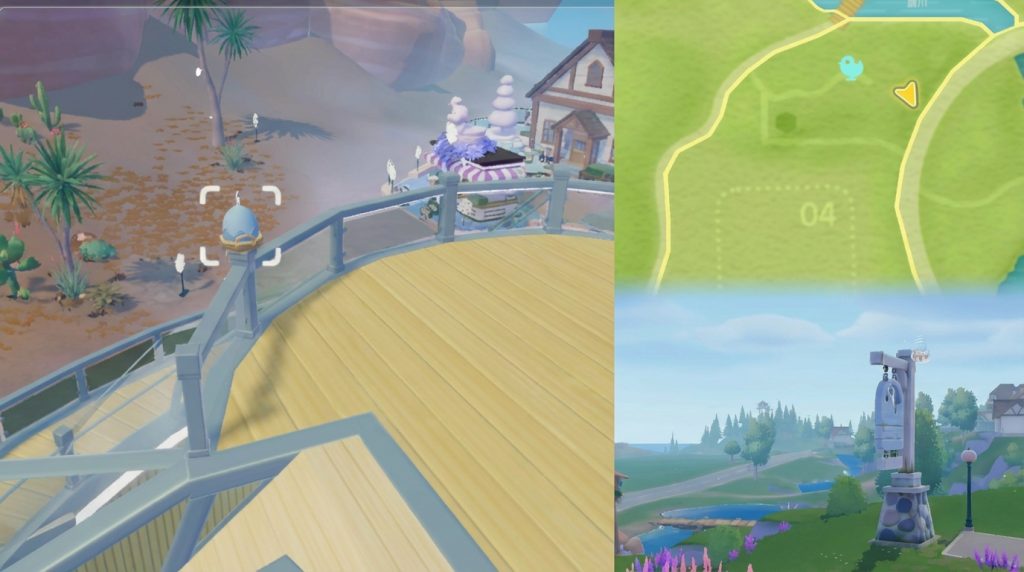 The next egg location (egg location 6) is on top of the tower at the beach, and the bubble is at the postsign near plot 4.