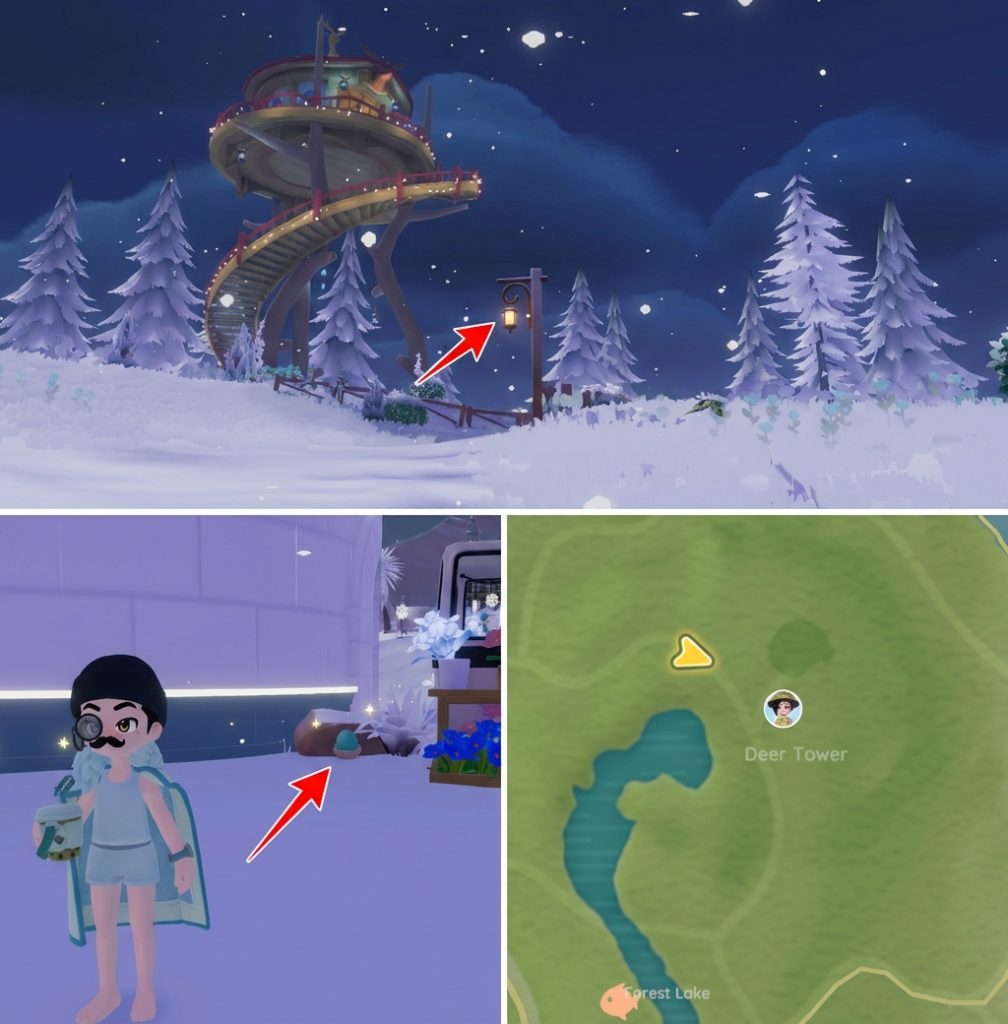 The next egg location is behind Blancs winter wagon, the bubble floats right at the lightpost at the deer tower in the forest.