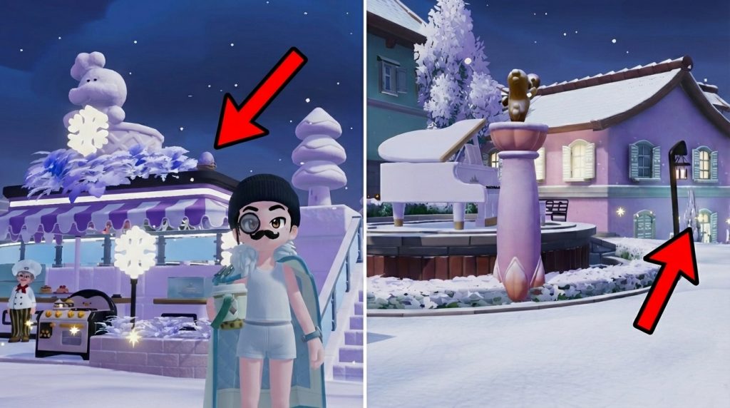 The first egg location is right behind Naughty on a wooden post, and the bubble right in front of the bus stop sign. (Snowman Bubble w/ Chair inside)
