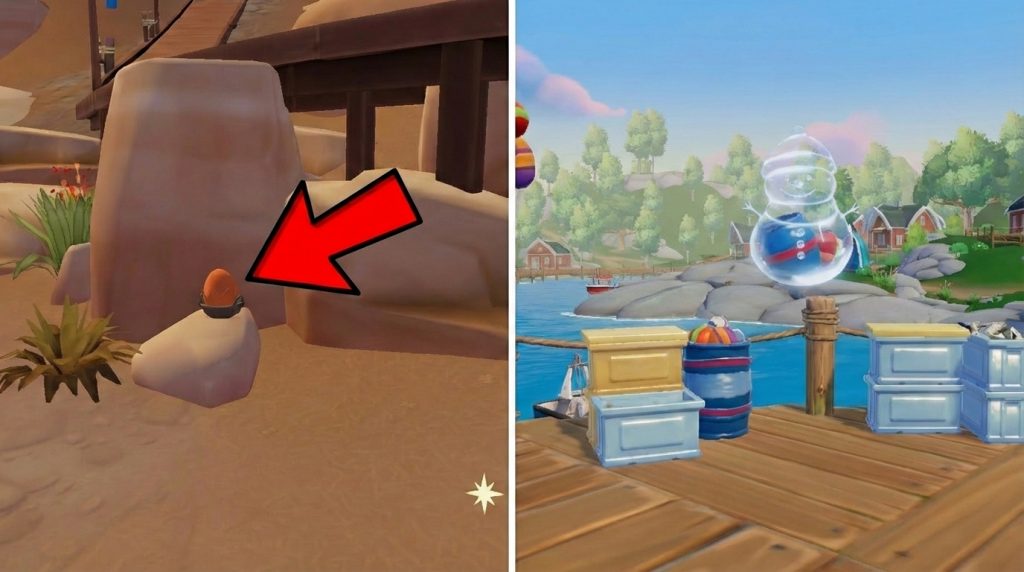 The next egg location is inside the tower on the beach, and the bubble in at the edge of the town at the piano rainbow bridge: