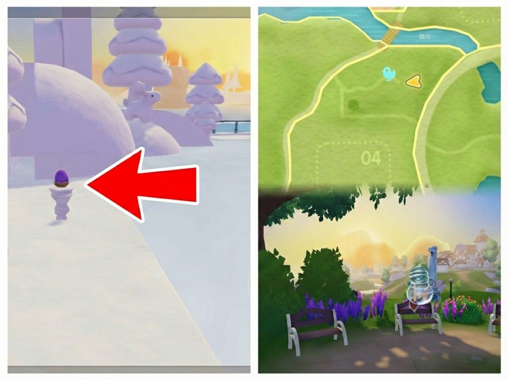 The next egg location (egg location 6) is on top of the tower at the beach, and the bubble is at the postsign near plot 4.